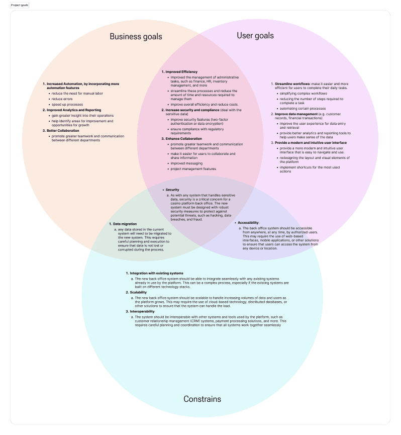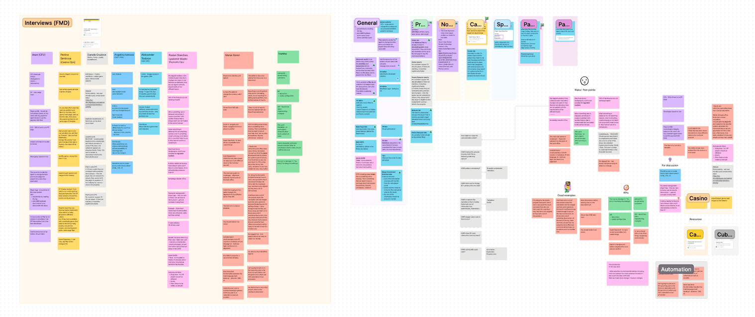 I started with stakeholder interviews for 2 reasons: I had just started in the company, the casino domain was completely new to me, and it was an excellent way to familiarize myself with the domain and define the business goals of the project.