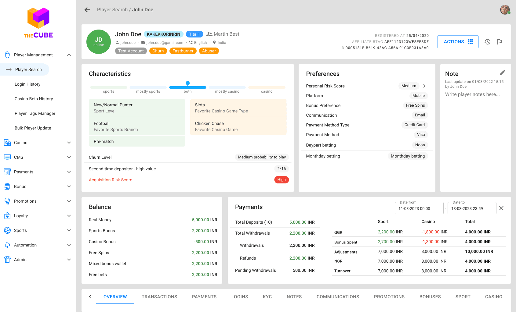 I started by redesigning of one of the most crucial pages; the player profile page. This page shows a player’s complete engagement with the system and is connected to all the verticals of the back office. It was also a beneficial approach in regard to the design system because the player profile contained a wide array of components that could be reused in other parts of the back office.